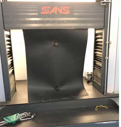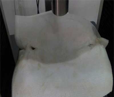 打孔拉伸测试用于测试膜材料在穿孔后固定的基本强度,测试方法为在膜上打孔,用固定销通过穿孔进行上下拉伸测试。经验证,由超高分子量聚乙烯纤维织物增强的TPU膜的打孔拉伸强度可以达到本体强度80%以上,是同等克重膜材的5倍以上。